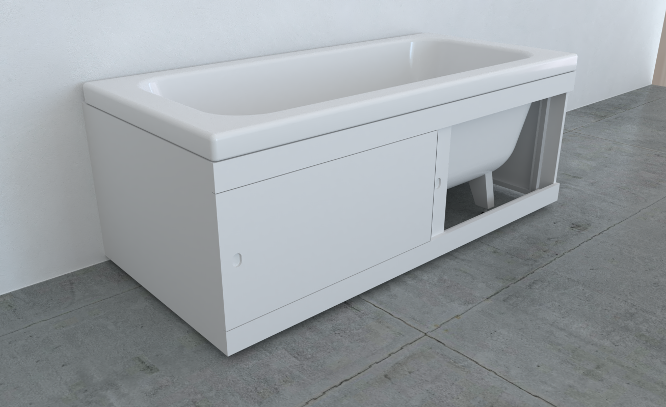Дверцы изготовлены из влагостойкой МДФ плиты высокого качества покрытое ПВХ пленкой. Створки движутся по пластиковым направляющим. Ручки утоплены в дверцах. Дополнительно возможно приобрести торцевые экраны.