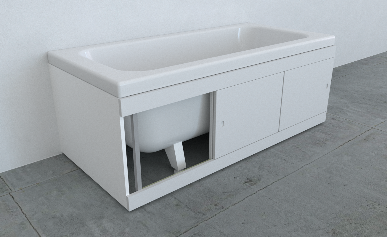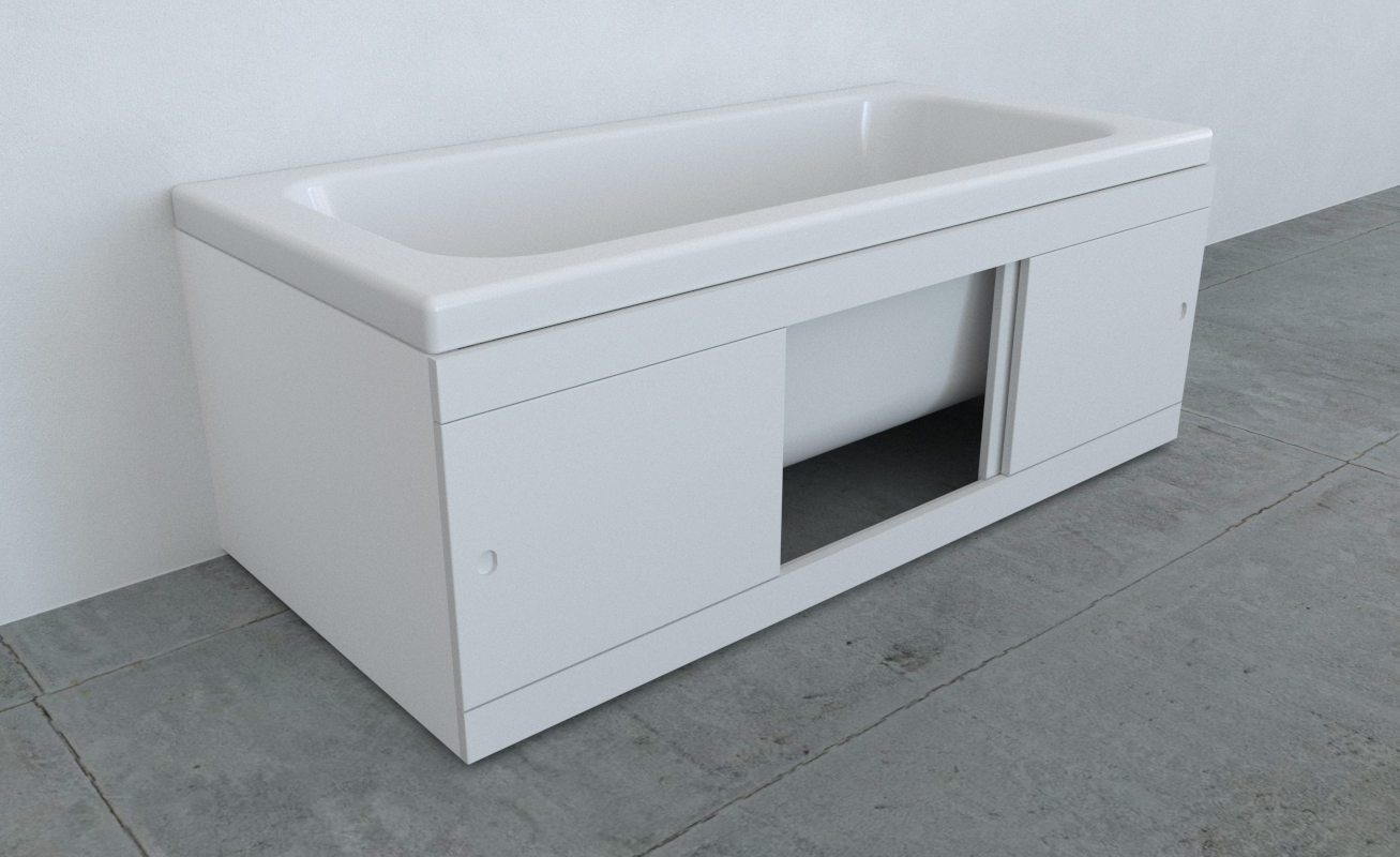 Дверцы изготовлены из влагостойкой МДФ плиты высокого качества покрытое ПВХ пленкой. Створки движутся по пластиковым направляющим. Ручки утоплены в дверцах. Дополнительно возможно приобрести торцевые экраны.