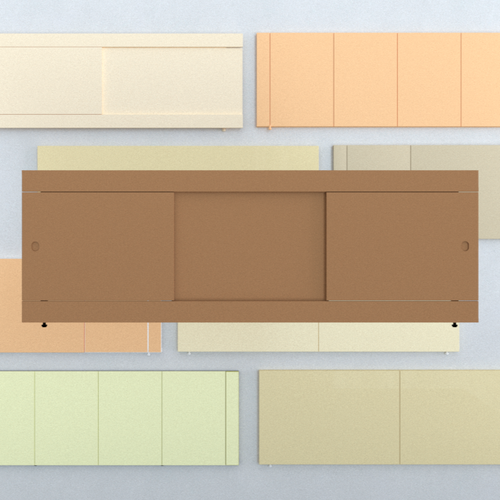 Дверцы изготовлены из влагостойкой МДФ плиты высокого качества покрытое ПВХ пленкой. Створки движутся по пластиковым направляющим. Ручки утоплены в дверцах. Дополнительно возможно приобрести торцевые экраны.